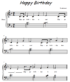 Pieces in three are really always felt in one. People aren’t used to singing it that way, so you have to impose it by force of your personality. Make sure that you launch the phrase in such a way that everybody feels the bars as beats. There is a huge impulse on “BIRTH” launched by a big up-beat on “Happy.” Don’t make the first bar an up beat to the second, rather pull the warm intensity out of the D of “Birth” and deliver it to “YOU!” Never forget that the point of the celebration is “YOU,” but the heavy beat is still on the first and third bar.