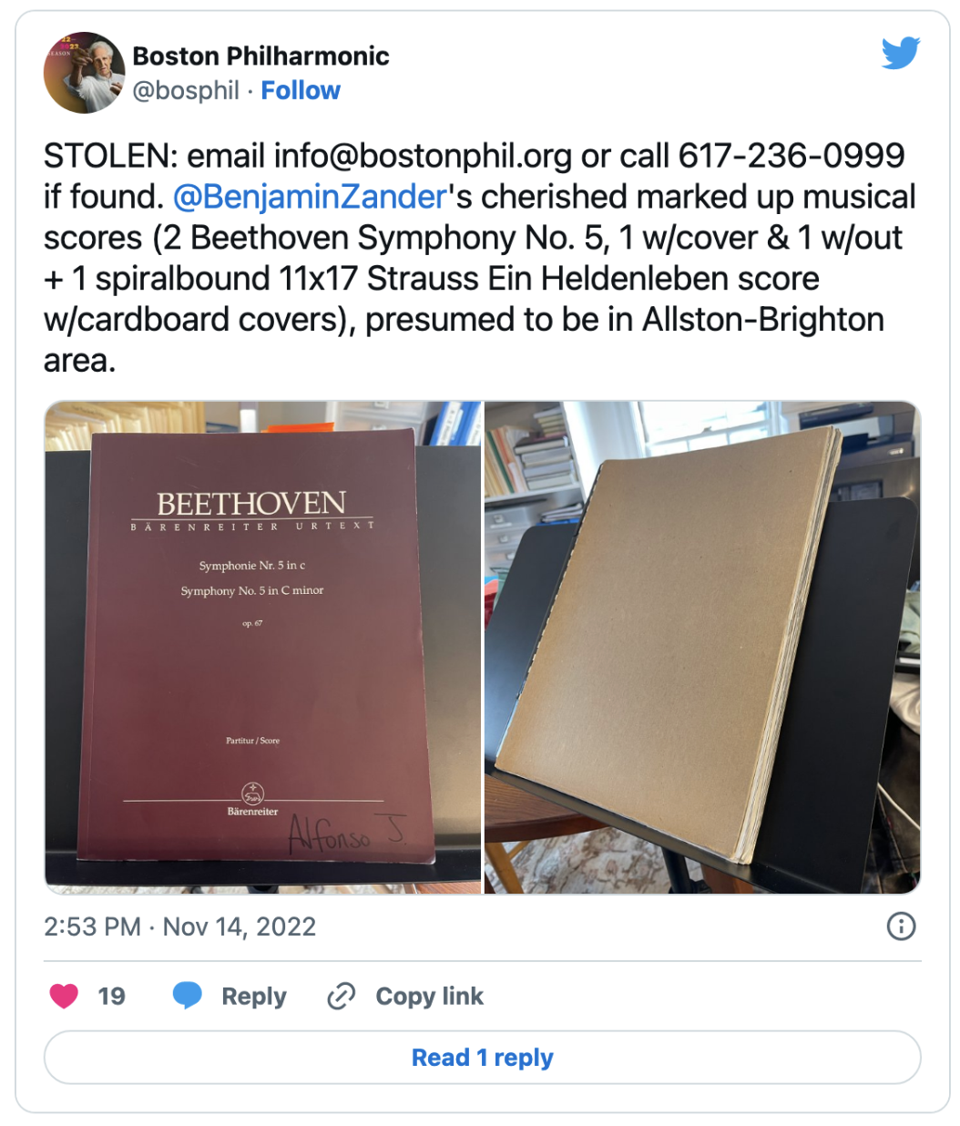 The tweet included a description of the missing documents — two copies of Beethoven’s Symphony No. 5 (one with its cover intact, the other without), and one spiral-bound copy of Strauss’ tone poem “Ein Heldenleben.”